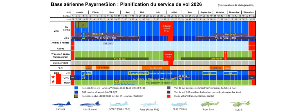 Geflogen wird in der Schweiz von Montag bis Freitag immer zwei Mal täglich. Die Morgenrunde findet zwischen 08.00 Uhr und 12.00 Uhr, die Mittagsrunde zwischen 13.15 Uhr und 17.00Uhr statt! Die Deutsche Luftwaffe verfährt hier nahezu gleich zu den Zeiten der Schweizer Luftwaffe!